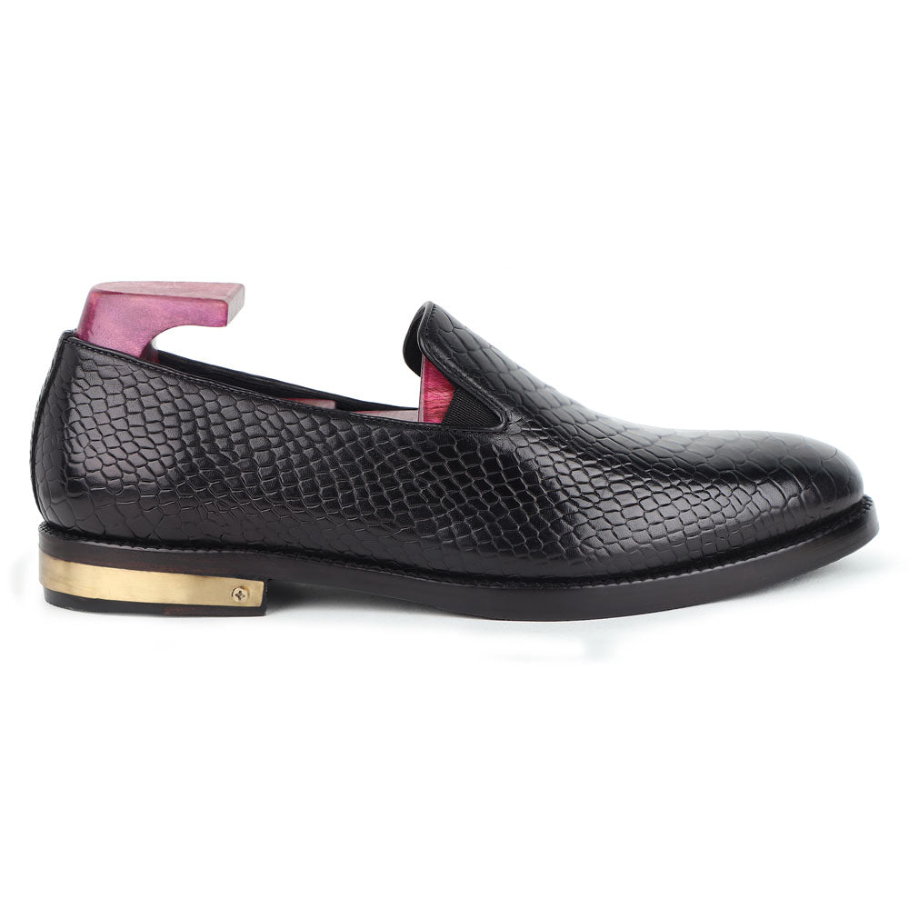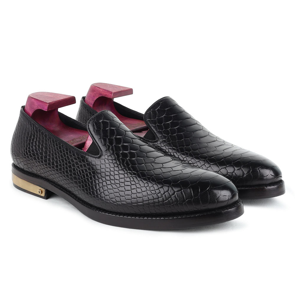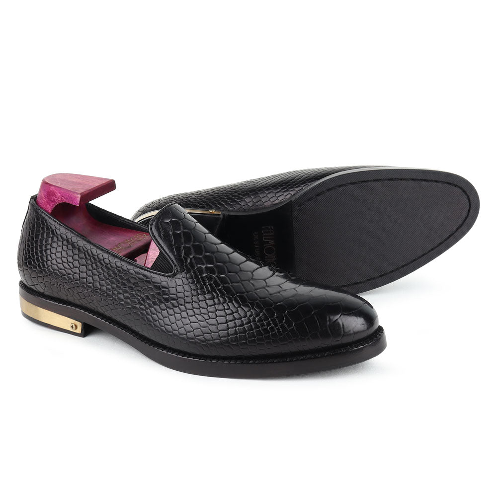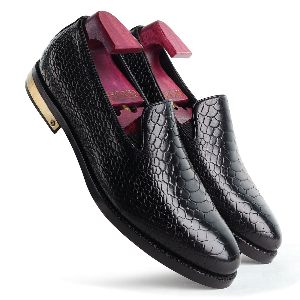 A tuxedo or formal black suit should be worn with these loafers. The shoes have a shiny black upper and a low-cut design. It is perfect for formal events such as formal party, weddings or a ball dance. But they might not look appropriate for everyday use.