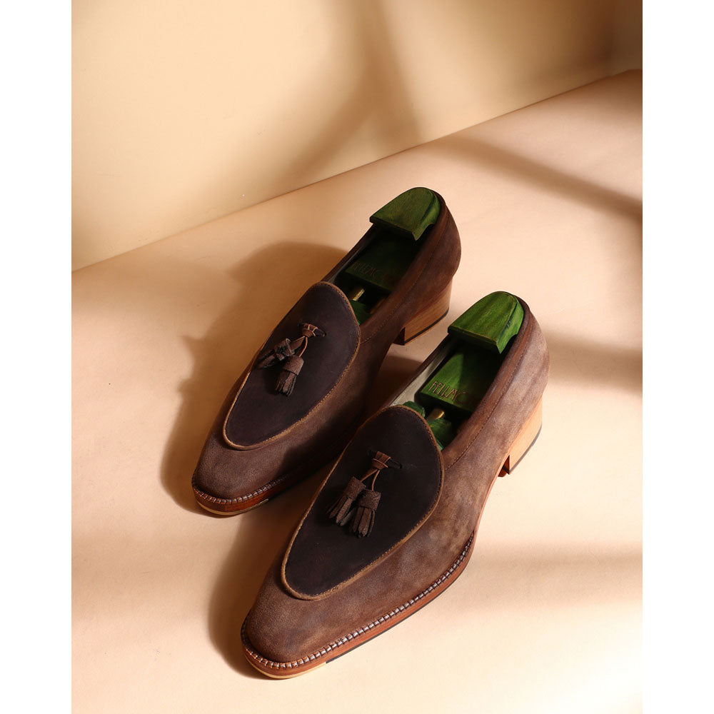 Brown + Sand Waxy Suede Belgian Tassel Loafers + Metal Toe + Cuban Heel